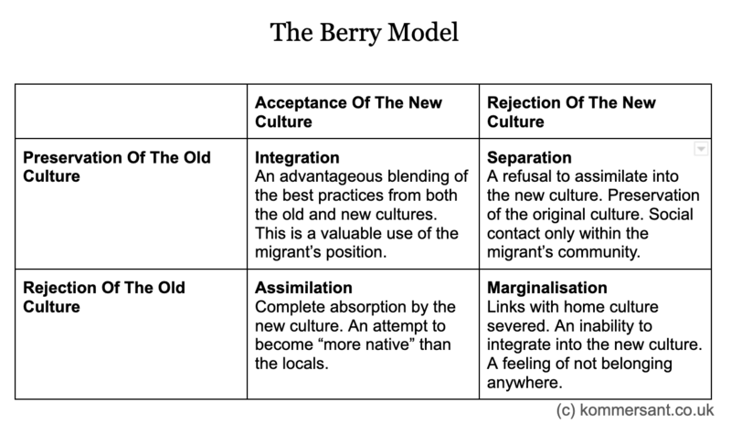 In 1970, the American anthropologist Philipp Bock proposed four strategies for resolving conflicts caused by culture shock. Later, the American psychologist John Berry developed them into a binary model. This proposes that migrants may either accept or reject the new culture, while simultaneously either retaining their original culture or rejecting it.