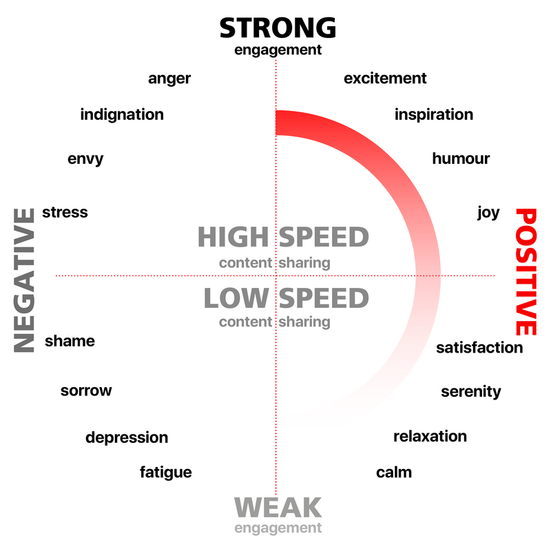 Virality has several elements. The first is feelings and emotions. A study by the New York Times into what material becomes viral and why includes a graph showing what emotions people felt on viewing content (such as articles, videos or photographs). It categorised the emotions into two groups depending on whether or not they encourage viewers to share the content.